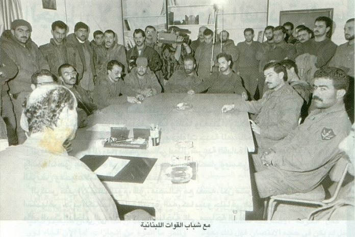 من اليمين جلوساً: الشهيد سهيل منسّى، حبيب نمور، نقولا ابو جمرا، طوني مرقس، ؟، جوزف شعيا، فادي الشاماتي، أسعد سعيد في مبنى الاوبرلي العام 1990