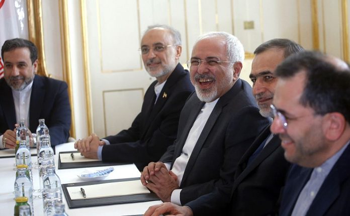Iranian Foreign Minister Javad Zarif (3dR) laughs at the start of a meeting with US Secretary of State (unpictured) after he came back at international discussion on nuclear policy at a hotel in Vienna, Austria, on June 30, 2015. Zarif's returned to Tehran on June 28 night after a weekend of intense negotiations as US Secretary of State John Kerry pressed ahead with efforts to seal a historic nuclear deal with Iran. AFP PHOTO / POOL / CARLOS BARRIA (Photo credit should read CARLOS BARRIA/AFP via Getty Images)